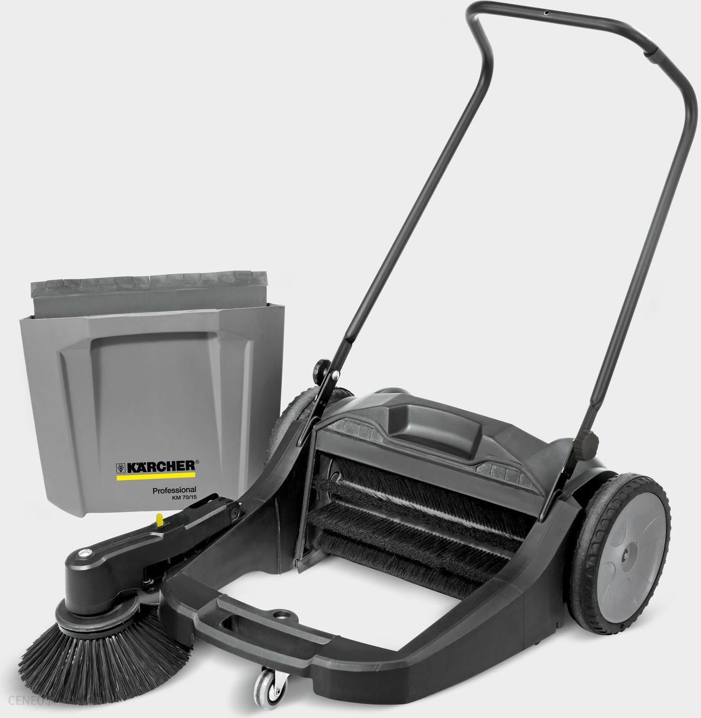 KM 70/15 C – Lekka, kompaktowa zamiatarka przeznaczona do utrzymania w czystości terenów zewnętrznych. Najlepiej sprawdza się na małych powierzchniach, gdzie konieczna jest łatwość manewrowania. Z uwagi na napęd ręczny jest szczególnie polecana do sprzątania na stacjach benzynowych. Charakteryzuje się cichą pracą, trwałą i prostą konstrukcją oraz wyjątkową łatwością obsługi. Trwała, prosta i niezawodna konstrukcja maszyny, sprawia że jest ona niemal całkowicie bezawaryjna. Mocna rama z tworzywa sztucznego oraz zbiornik zanieczyszczeń są odporne na mechaniczne uszkodzenia. Szczotki zamiatające napędzane są przez oba koła tylne, co umożliwia skuteczne zamiatanie także podczas zakręcania. Szczotka boczna zwiększa szerokość roboczą urządzenia oraz umożliwia zamiatanie przy ścianach i krawężnikach. Wygoda obsługi przekłada się na regulowane położenie uchwytu prowadzącego. Dzięki temu można go dopasować do wzrostu osoby obsługującej. Podczas przechowywania, w celu zmniejszenia przestrzeni zajmowanej przez zamiatarkę, uchwyt prowadzący można całkowicie złożyć.